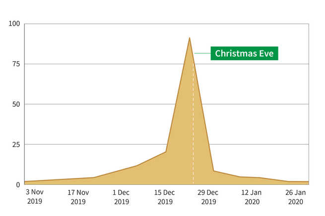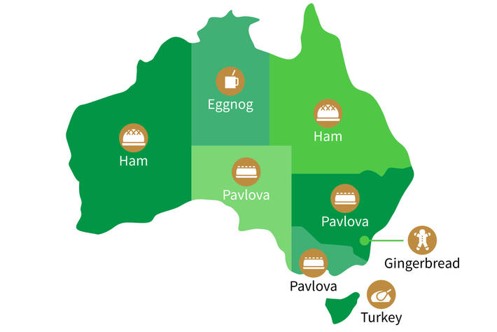 The map below highlights which states had the largest percentage increase in search interest for different festive dishes over the Christmas period. New South Wales, Victoria, and South Australia all share pavlova as the dish with the biggest spike in search interest. Turkey and ham have the biggest spike in searches in Tasmania and Queensland, respectively.