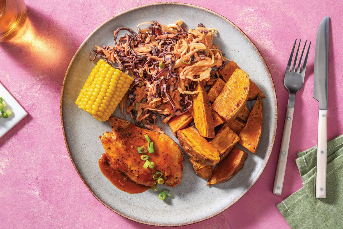 Eat the rainbow with this tasty mix of all-American flavours. Chicken breast gets a lightly spiced and saucy coating, while sweet potato wedges, corn cobs and a zesty slaw round out the meal. It's a taste of an American BBQ right in your own home!