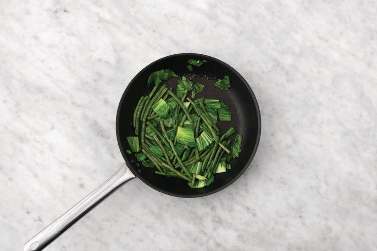 • Boil the kettle. • Trim and halve green beans. • Roughly chop Asian greens. • Cut chicken tenderloins into 2cm chunks. • Heat a large frying pan over medium-high heat with a drizzle of olive oil. Cook green beans, tossing, until tender, 4-5 minutes. Add Asian greens and cook, tossing until wilted, 1 minute. Transfer to a bowl.
