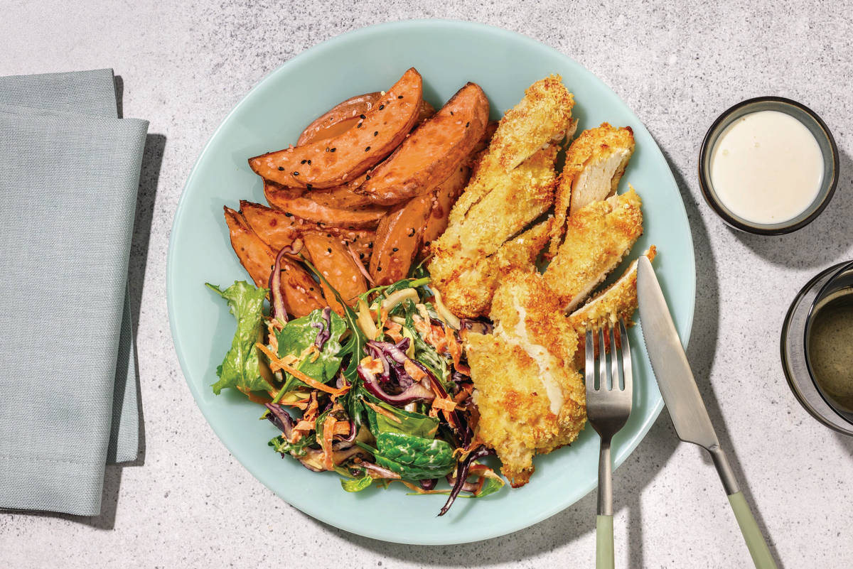 • Slice chicken into strips. • Divide Southeast Asian crumbed chicken, sesame sweet potato wedges and Asian slaw between plates. • Serve with sesame mayo. Enjoy!