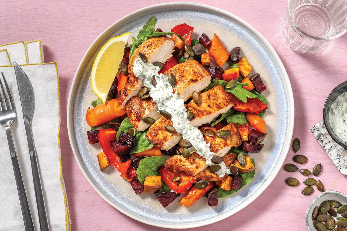 Slice the Aussie chicken. Divide the roast veggie salad between plates. Top with the chicken. Drizzle over some of the dill parsley mayonnaise. Garnish with the pepitas. Serve with the lemon wedges and remaining mayo.