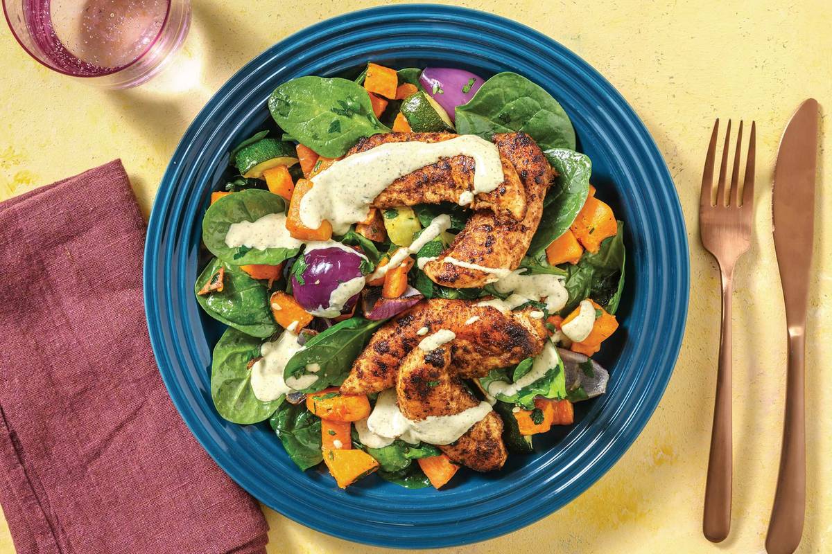• In a bowl, add roasted veggies, spinach and parsley. Season and toss • Serve salad topped with chicken and pumpkin • Drizzle with pesto dressing and sprinkle with pepitas