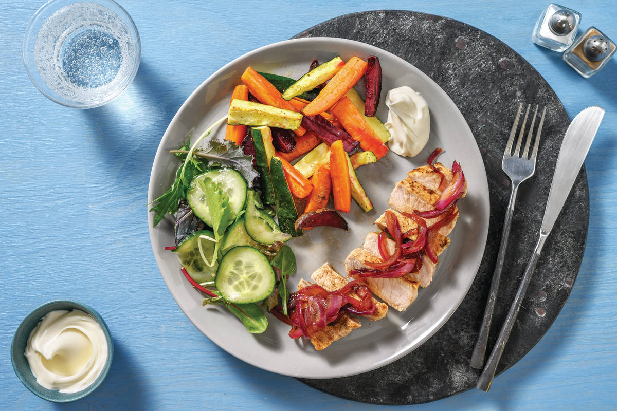 Slice the Aussie pork steak and divide between plates. Pour over any remaining pan juices and top the pork with the caramelised onion. Serve with the veggie fries, mixed salad and garlic aioli.