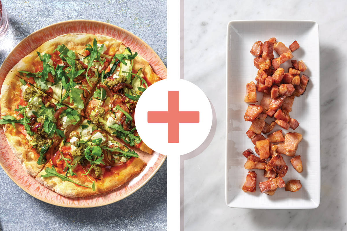 • While pizza is baking, • In a medium frying pan, heat a drizzle of olive oil over a medium-high heat. When oil is hot, cook diced bacon, breaking up with a spoon, until golden, 4-6 minutes. Transfer to a bowl and cover to keep warm. • Return the pan to a medium heat with a drizzle of olive oil, if needed. Cook onion, stirring regularly until softened, 5-6 minutes. Reduce heat to medium. Add balsamic vinegar, water and brown sugar, then mix well. Cook until dark and sticky, 3-5 minutes.