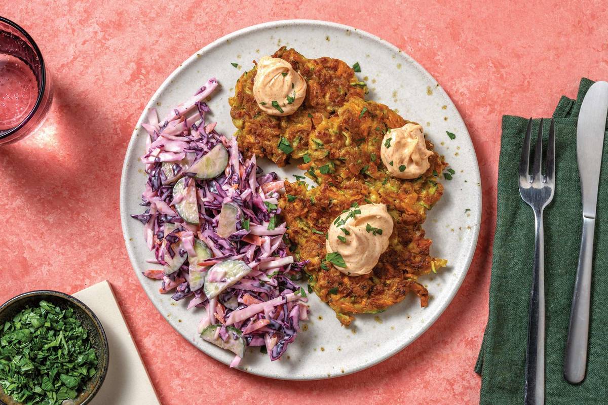• Roughly chop parsley. • Divide bacon, zucchini and Cheddar fritters and the slaw between plates. Top with smokey aioli. • Garnish with parsley to serve. Enjoy!