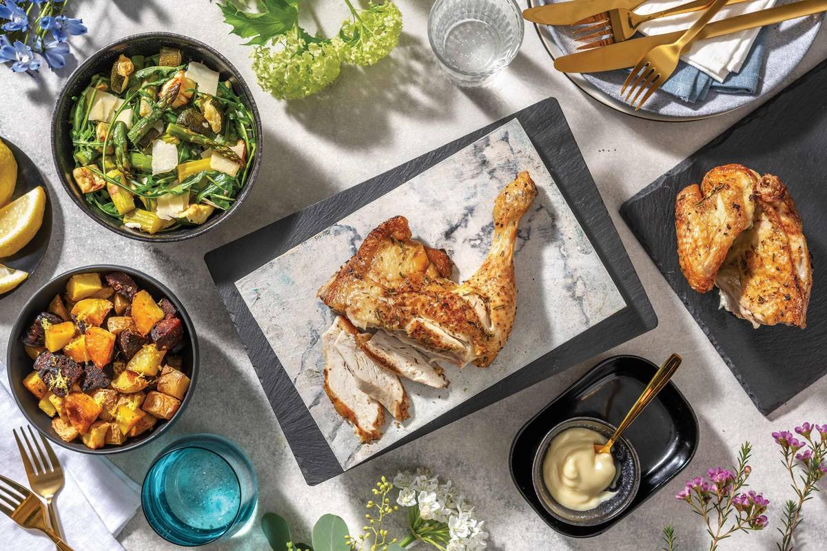 Slice the rosemary lemon chicken and divide between plates with the resting juices. Serve alongside the chorizo potatoes, grilled asparagus, zucchini & Parmesan salad and Italian truffle mayonnaise.