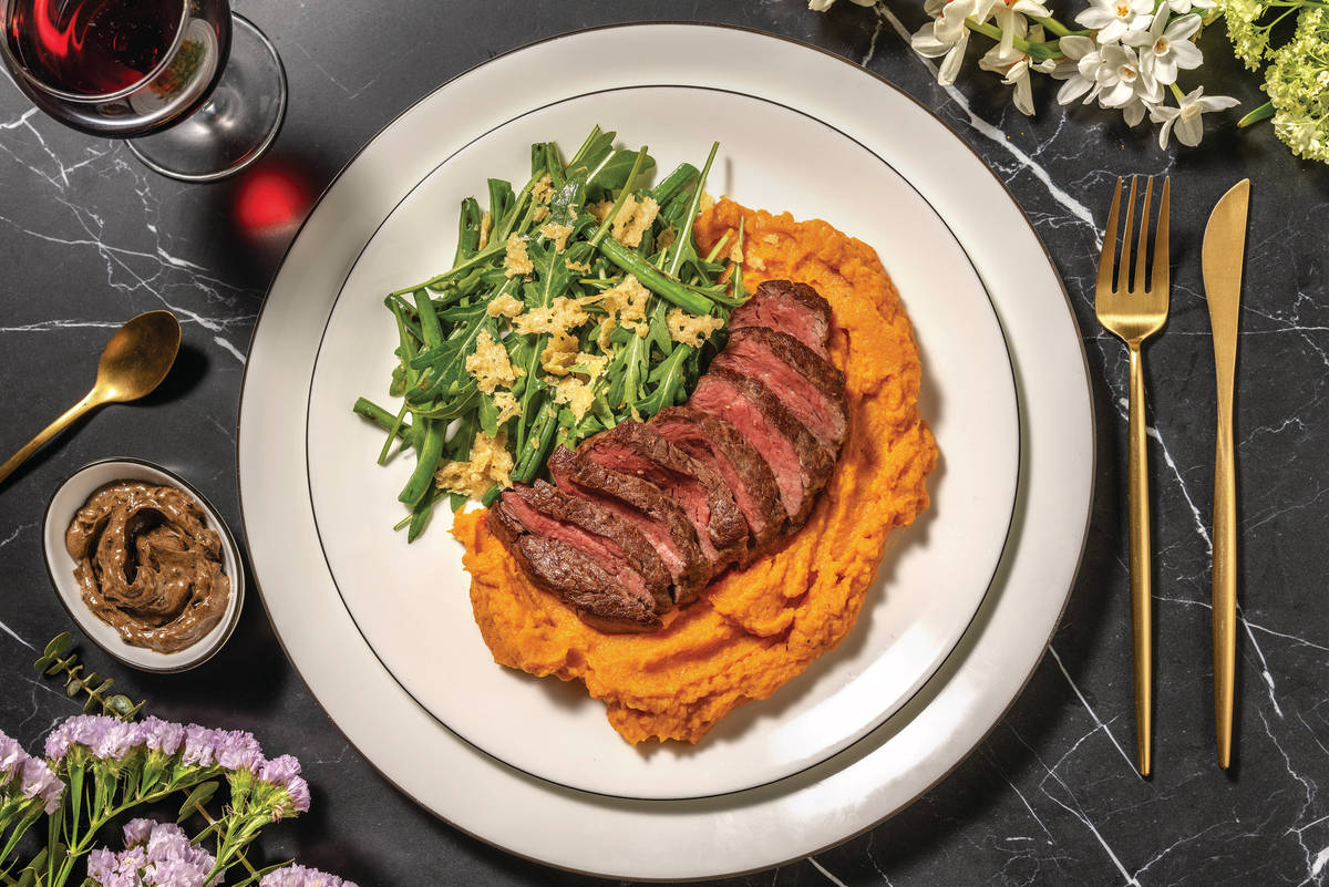• Slice beef. • Divide beef eye fillet, sweet potato mash and green bean salad between plates. • Crumble Parmesan crisps over salad. • Serve with black garlic mayo. Enjoy!