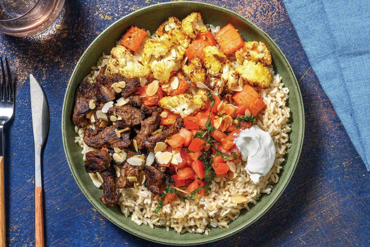 • Divide brown rice between bowls. • Top with chermoula-spiced beef, spiced veggies and tomato-mint salsa. • Dollop over garlic sauce to serve. Enjoy!
