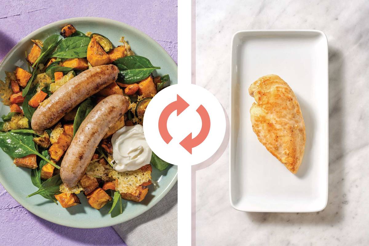 Custom Recipe: If you've swapped to chicken breast, when the potato and chopped veggie mix have 15 minutes remaining, season chicken breast on both sides. In a large frying pan, heat a drizzle of olive oil over medium-high heat. Cook chicken, until browned, 2 minutes each side. Transfer chicken to a second lined oven tray and bake until cooked through (when no longer pink inside!), 8-12 minutes.