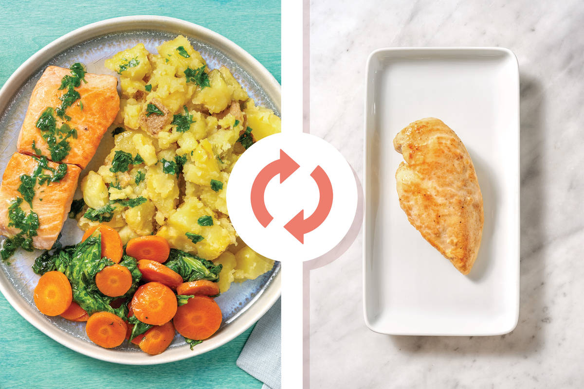 You can't go wrong with the classic combo of chicken and fresh herbs. Complete the dish with crushed potatoes to balance out the lovely richness of the chicken and sauce, plus garlic-laced veggies for some extra colour, texture and goodness.