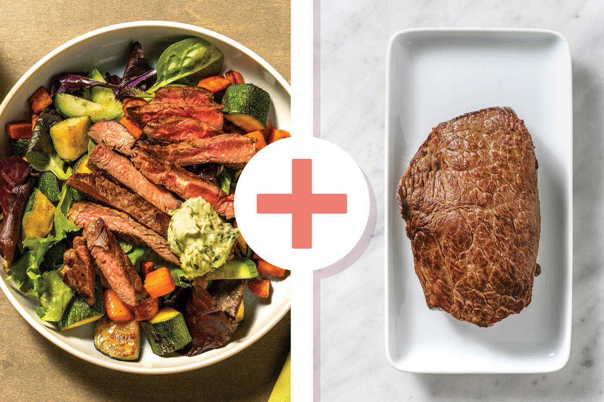 • Slice beef rump. Drizzle over chimichurri mayo. • Divide roast veggies, cucumber salad and beef rump between plates to serve. Enjoy!