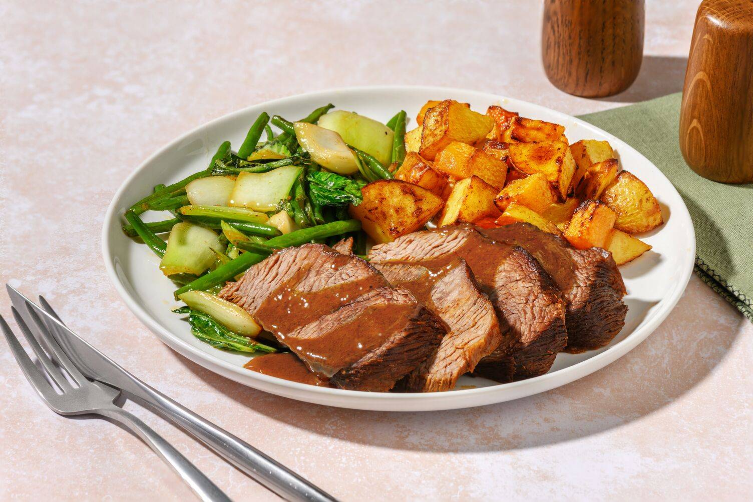 - Serve with red wine pepper jus. Enjoy!