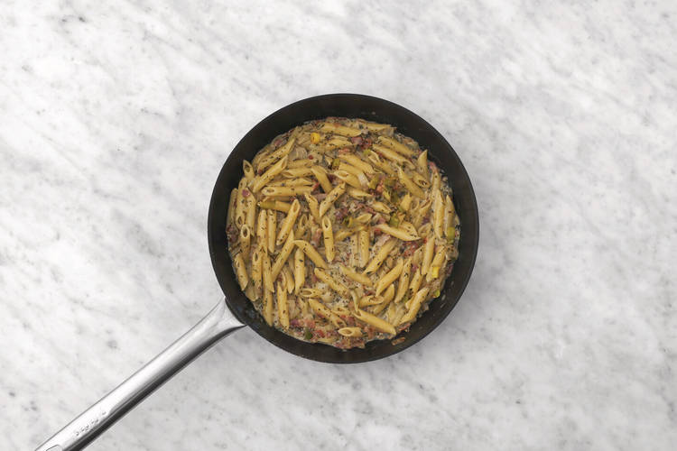 • Remove pan from heat, then stir through basil pesto and cooked pasta. Season to taste and set aside.