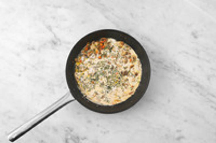 • To the pan with the mushrooms, add light cooking cream, herb & mushroom seasoning,and reserved pasta water. Stir to combine and simmer until slightly thickened, 2-3 minutes.