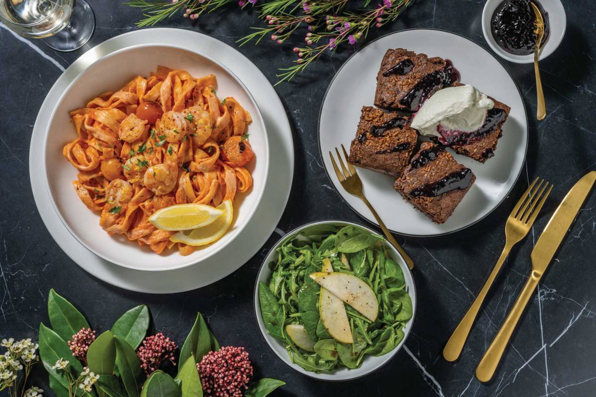 ⢠Roughly chop parsley leaves. ⢠Divide creamy tomato fettuccine between bowls. Top with prawns. ⢠Sprinkle with parsley and a pinch of chilli flakes (if using). ⢠Serve with pear salad and any remaining lemon wedges. Enjoy!