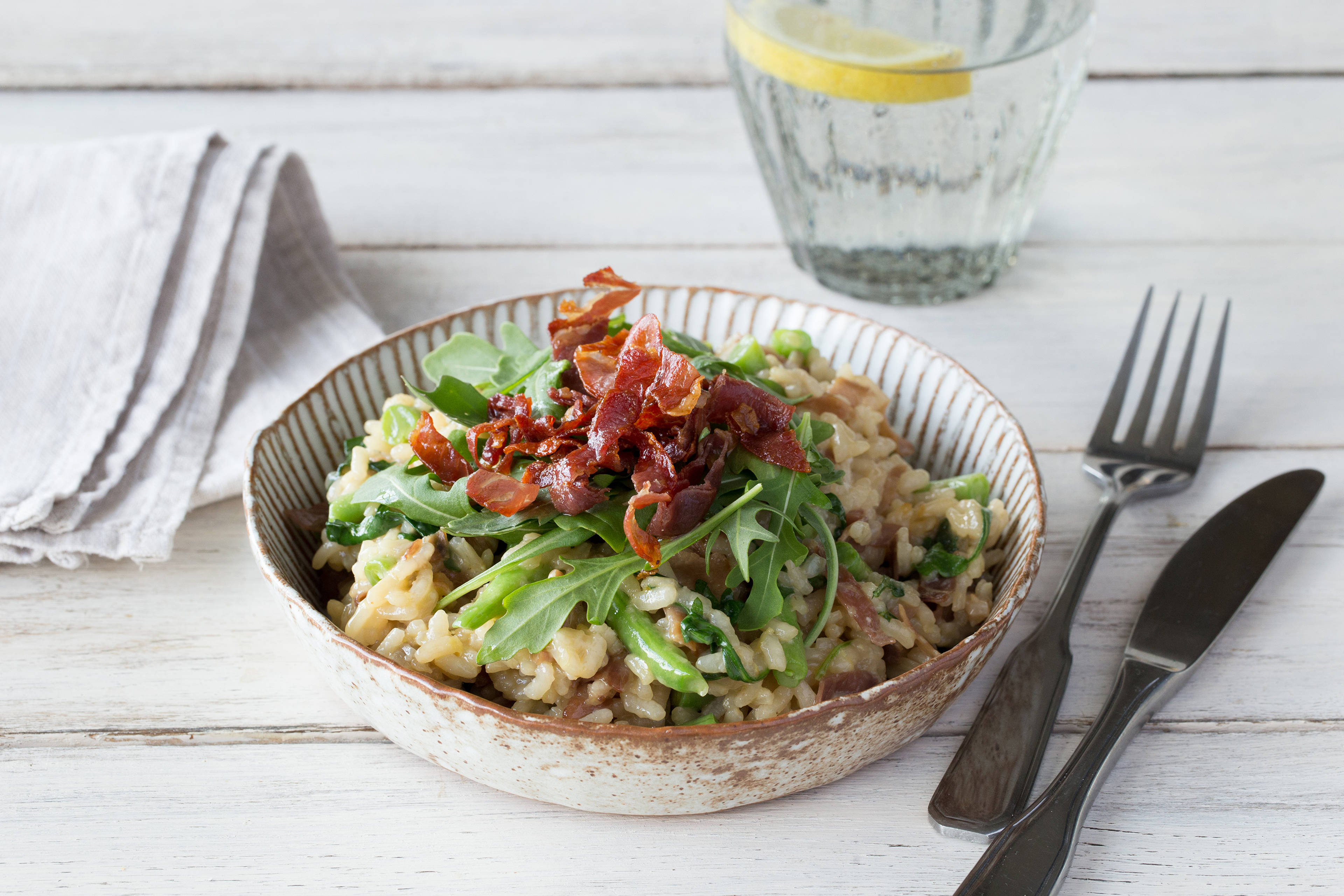 • Divide double bacon and mushroom risotto between bowls. • Serve with apple salad. Enjoy!