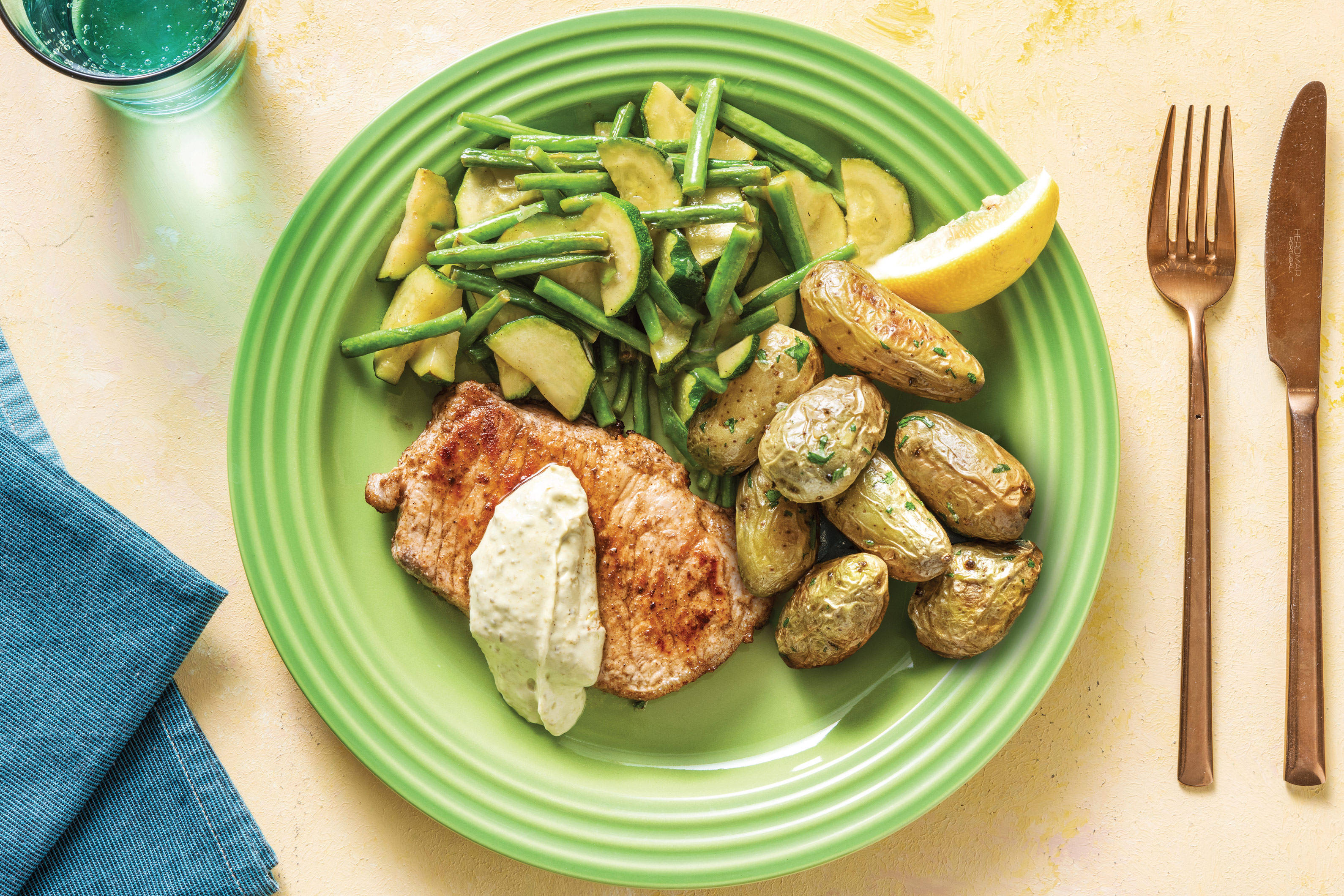 • While pork is cooking, trim baby broccoli and halve lengthways. • Wipe out frying pan and return to medium-high heat with a drizzle of olive oil. • Cook baby broccoli and trimmed green beans, until tender, 5-6 minutes. Season to taste.