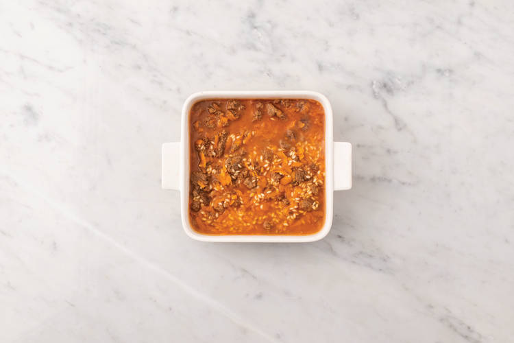 • Preheat oven to 220°C/200°C fan-forced. Boil the kettle. • In a large frying pan, heat a drizzle of olive oil over medium-high heat. Cook beef mince, breaking up with a spoon, until just browned, 4-5 minutes. • Meanwhile, grate carrot, then set aside. Roughly chop snacking tomatoes. • In a medium bowl, combine snacking tomatoes and baby spinach leaves. Set aside.