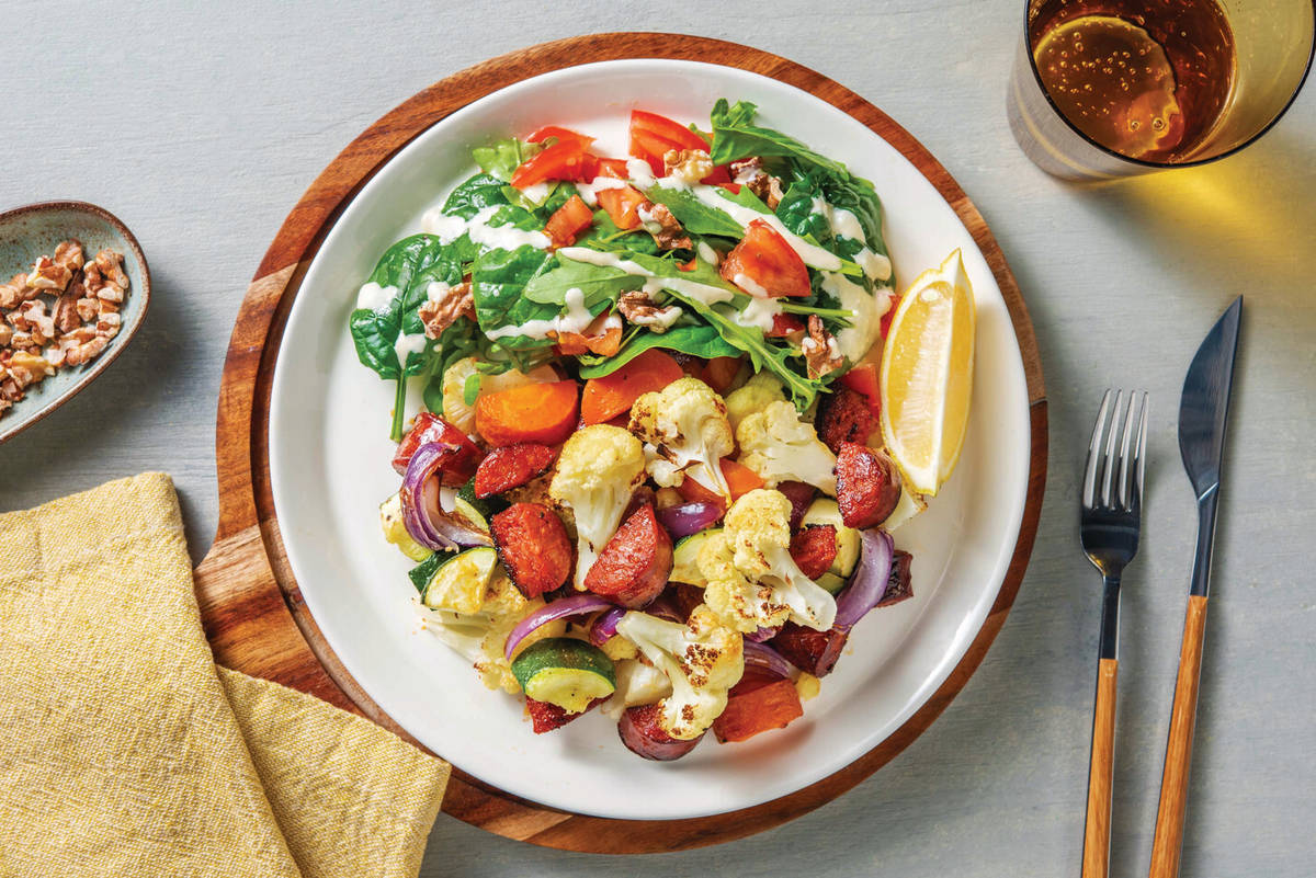 • Divide chorizo and lemony veggie traybake and fennel and walnut salad between plates. • Drizzle caesar dressing over salad, then sprinkle with walnuts. • Serve with any remaining lemon wedges.