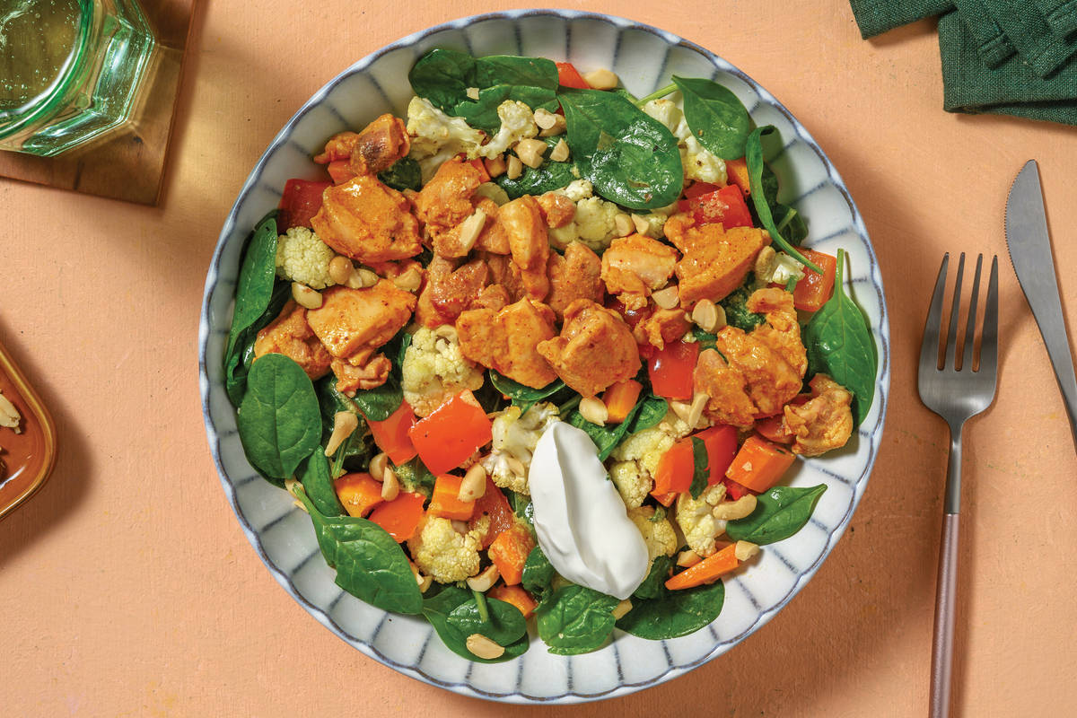 • Divide roast veggie and spinach toss between plates. Top with Mumbai yoghurt chicken, spooning over any juices from the pan. • Serve sprinkled with crushed peanuts and a dollop of remaining yoghurt.