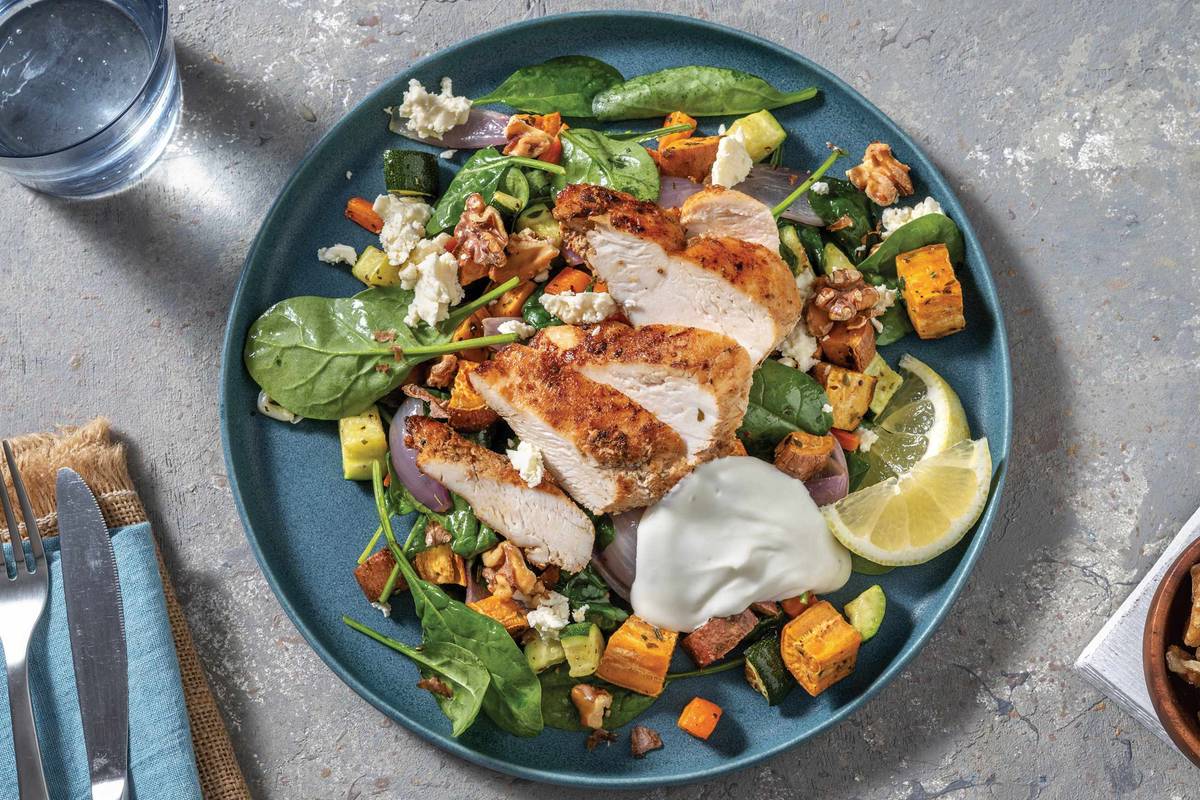 • Slice the chicken. Divide the roasted veggies between plates and top with the spiced chicken. • Top with the lemon yoghurt and crumble over the fetta cubes. Garnish with the walnuts and serve with any remaining lemon wedges. Enjoy!