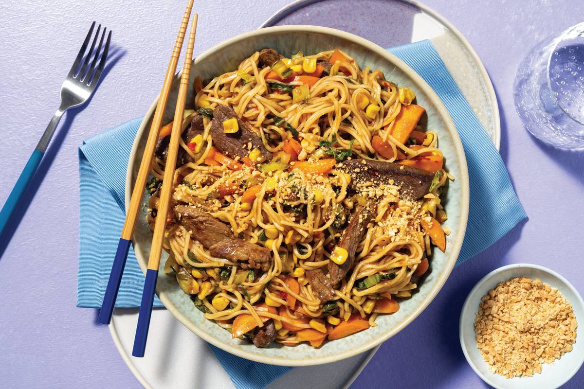 ⢠While the noodles are cooking, heat a large frying pan over high heat with a drizzle of olive oil. When oil is hot, cook beef strips and the salt, in batches, tossing, until browned and cooked through, 1-2 minutes. Transfer to a plate. ⢠Return pan to medium-high heat with a drizzle of olive oil. Cook carrot, tossing, until softened, 2-3 minutes. Add Asian greens and corn tossing, until softened, 2 minutes.