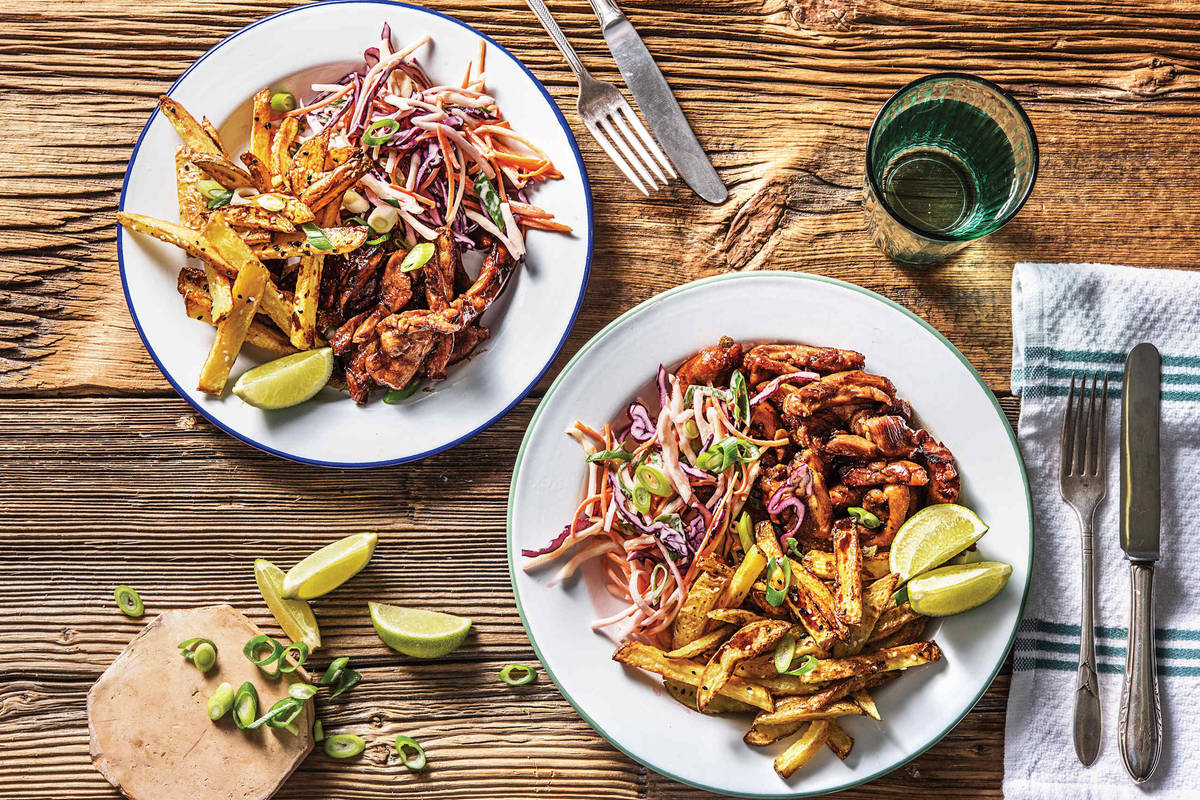When the fries have 10 minutes of cook time left, heat a drizzle of olive oil in a large frying pan over a high heat. Once hot, add the chicken to the pan and cook, tossing, for 3-4 minutes, or until browned. Add the remaining marinade and simmer, stirring, for 1-2 minutes or until reduced slightly. TIP: The marinade will darken and caramelise – this adds to the flavour! TIP: If your pan is getting crowded, cook in batches for best results!