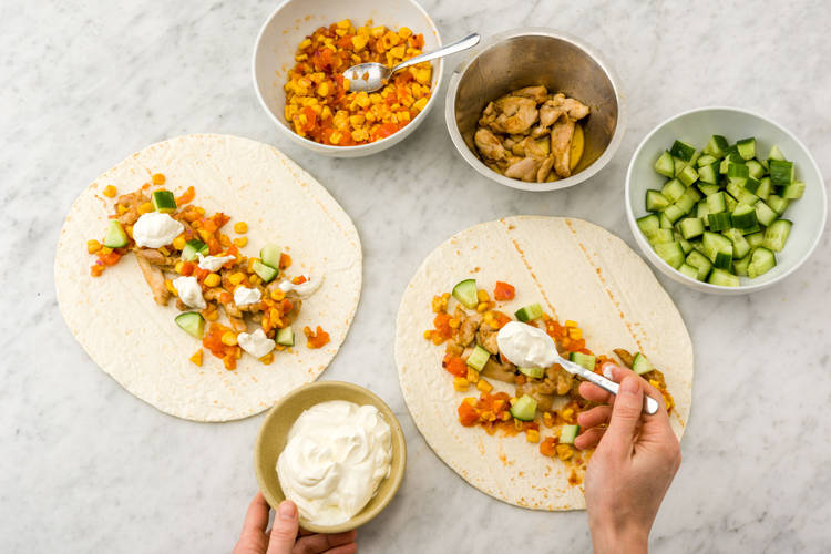Serve up the warmed tortillas, paprika spiced chicken, corn salsa, light sour cream, cucumber and remaining lime wedges and let everyone create their own sizzling chicken burrito masterpiece!