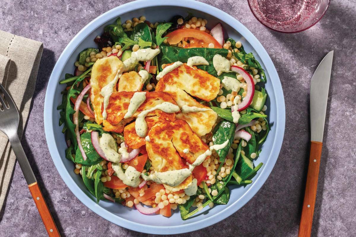 • Top with haloumi and drizzle with creamy pesto dressing to serve. Enjoy!