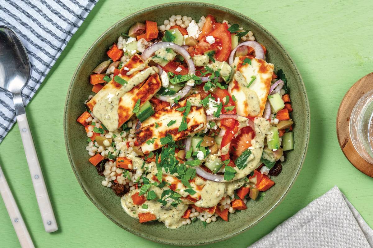 • Divide Greek-style couscous between bowls. • Top with haloumi and chicken. Drizzle with Greek-style yoghurt. Tear over dill to serve. Enjoy!