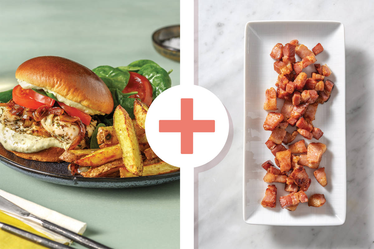 Spread a layer of creamy pesto dressing over the base of each bun. Top with the herby chicken, bacon, caramelised onions and remaining tomato and baby spinach leaves. Serve with the salad and fries.