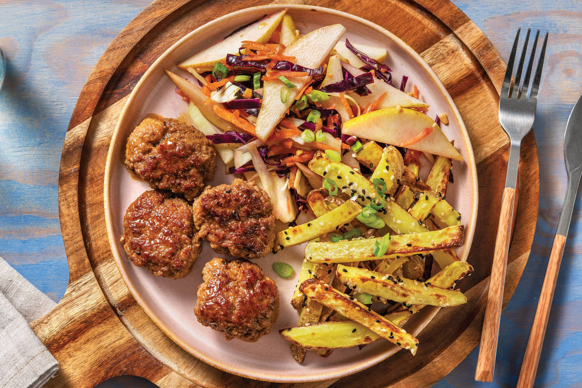 How to upgrade your everyday rissoles? Toss them in some honey-soy glaze, of course! Complete with fragrant sesame fries and Asian-style slaw, this is definitely not your average weeknight dinner.