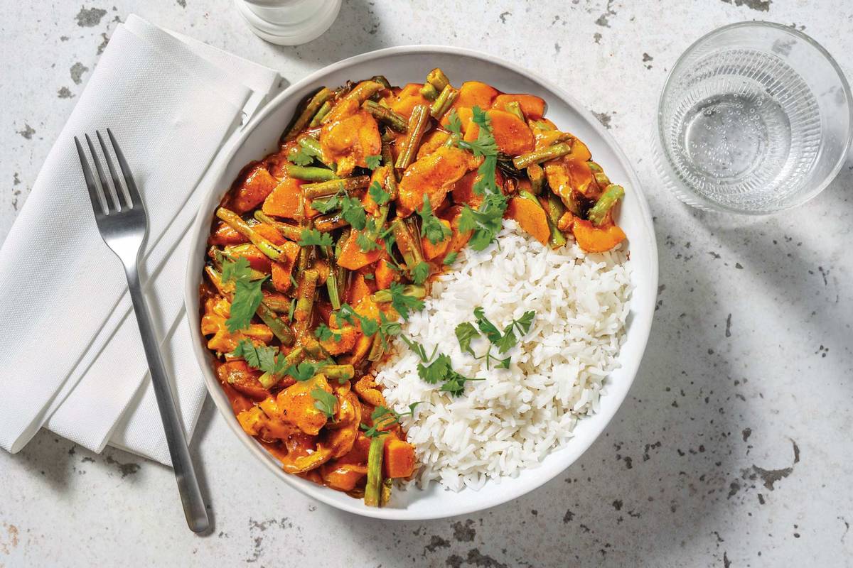 • Heat a large frying pan over medium-high heat. Cook green beans and carrot, tossing, until tender, 4-6 minutes. Transfer to a bowl and set aside. • Return frying pan to high heat with a drizzle of olive oil. When oil is hot, add chicken and cook in batches, tossing occasionally, until browned and cooked through, 5-6 minutes. • Reduce heat to medium and add ginger paste, garlic paste, tandoori paste and mild North Indian spice blend to the pan. Cook until fragrant, 1-2 minutes. • Add light cooking cream, the water (for the sauce), brown sugar, cooked veggies and the salt, simmer until slightly thickened, 2-3 minutes. TIP: Chicken is cooked through when it is no longer pink inside.
