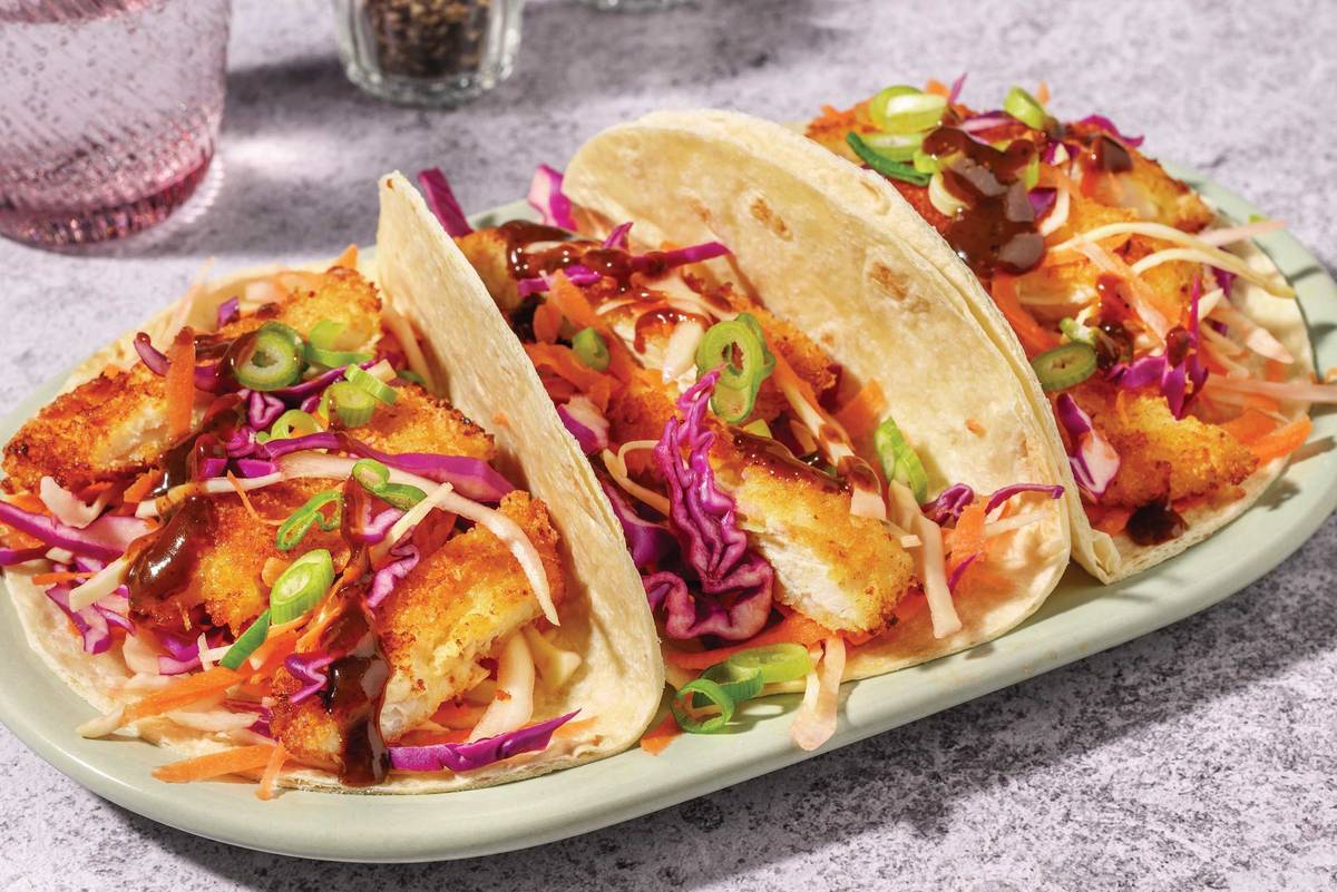 • Fill tacos with creamy slaw and Japanese pork schnitzels.