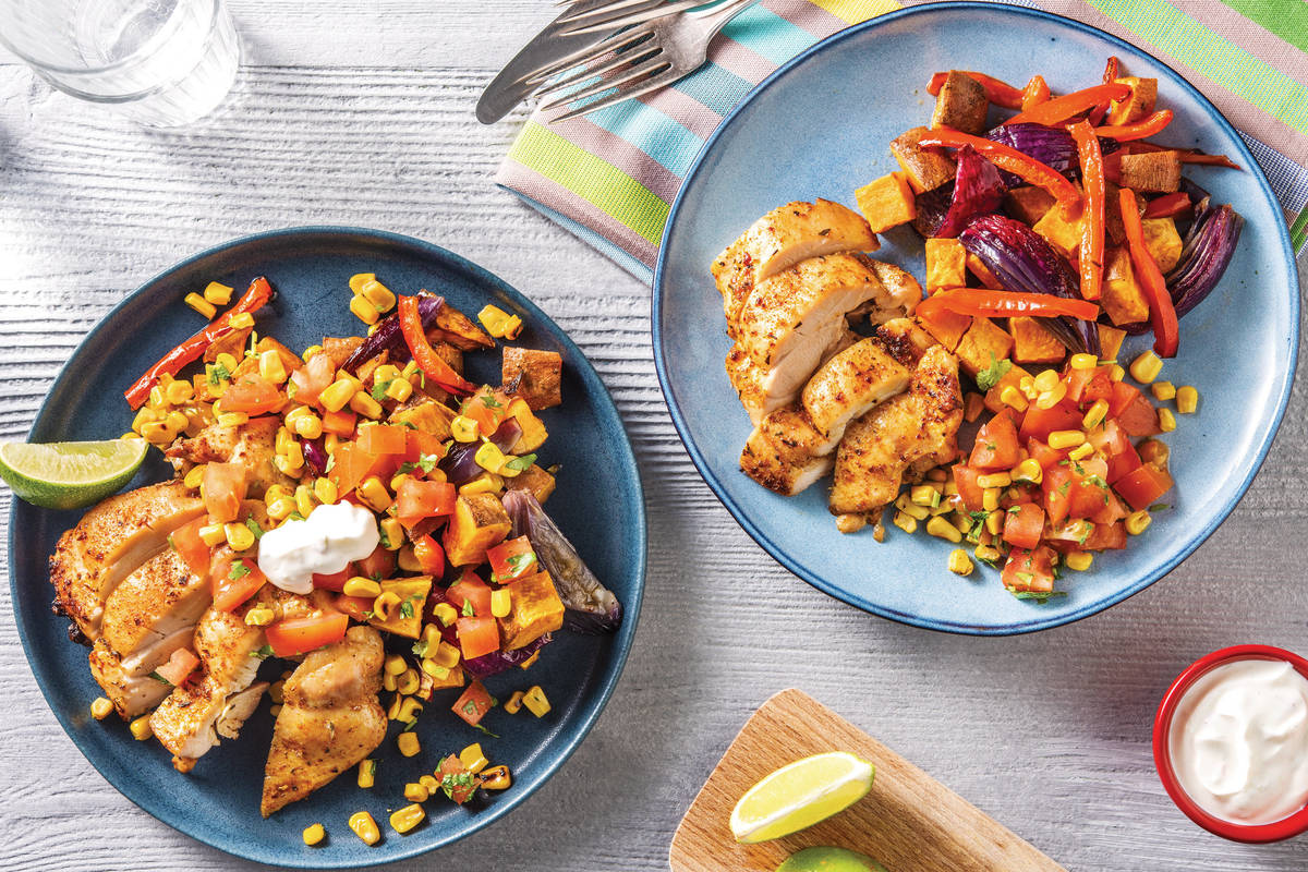 Thickly slice the chicken. Divide the jerk chicken and veggie traybake between plates. Top with the charred corn salsa and lime and chilli yoghurt. Squeeze over the lime wedges to serve. TIP: For kids, see our serving suggestion in the main photo!