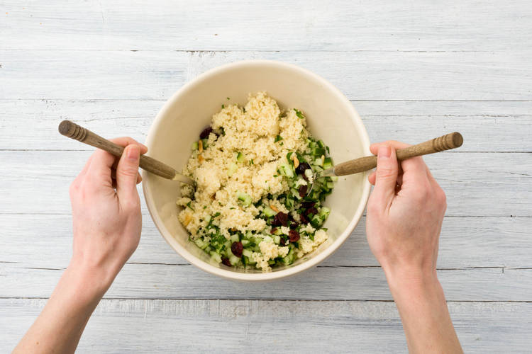 Meanwhile, place the couscous in a medium bowl. Pour the boiling water over the couscous, stir with a fork, and then cover the bowl tightly with cling wrap. Leave to sit for 5 minutes. Remove the cling wrap and fluff the couscous with a fork.