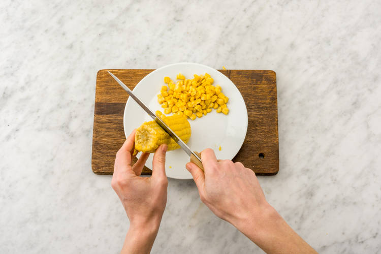 Preheat the oven to 200°C/180°C fan-forced. To prepare the ingredients, husk and remove corn kernels, finely chop the red onion, finely dice the tomato, cut lime into wedges, slice chicken into strips, finely dice the cucumber and deseed and finely slice the chilli.
