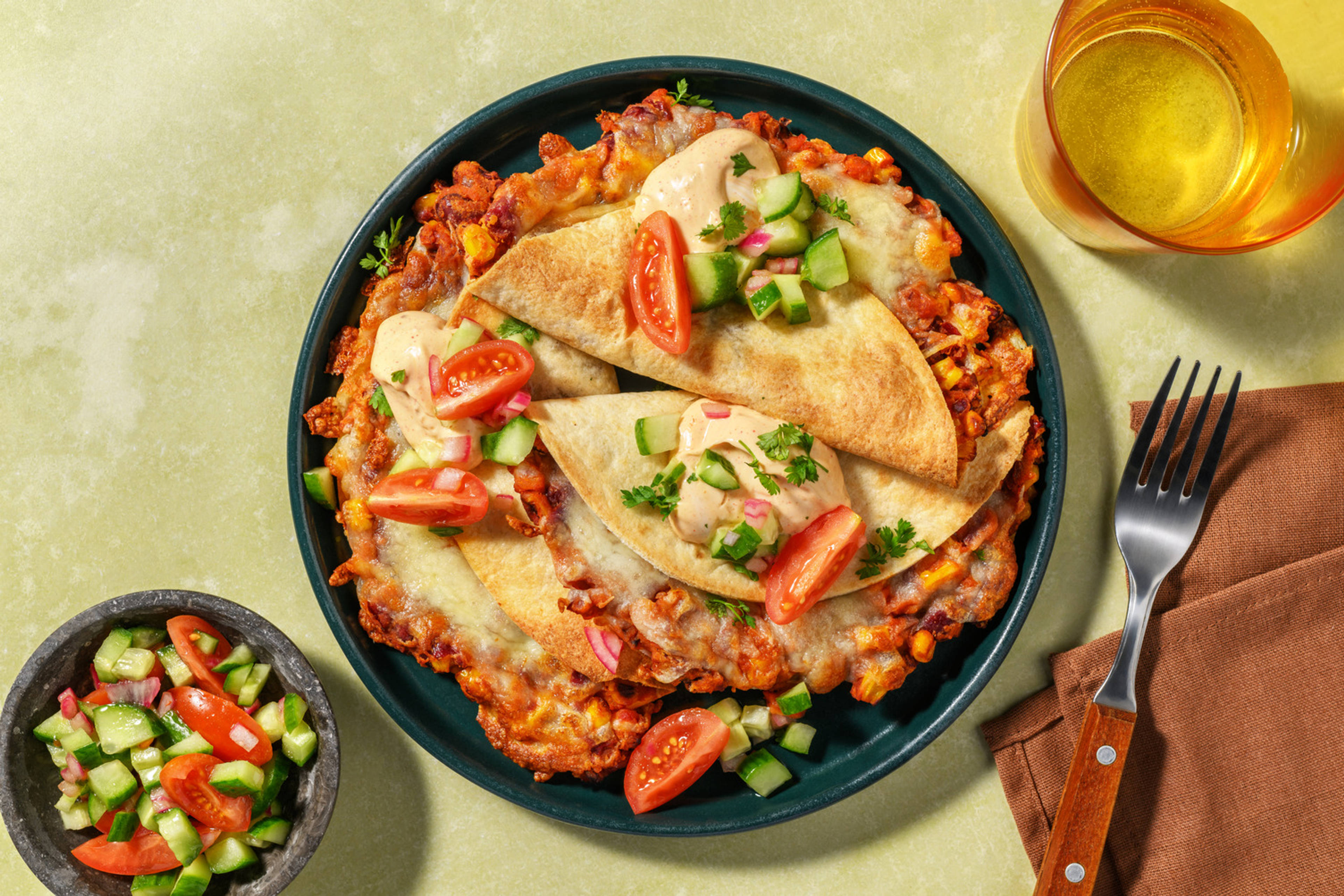 Simply combine your prepared ingredients and place them on a tortilla. Fry the tortilla on medium heat, and add cheese and another tortilla on top. Cook both sides until golden brown.