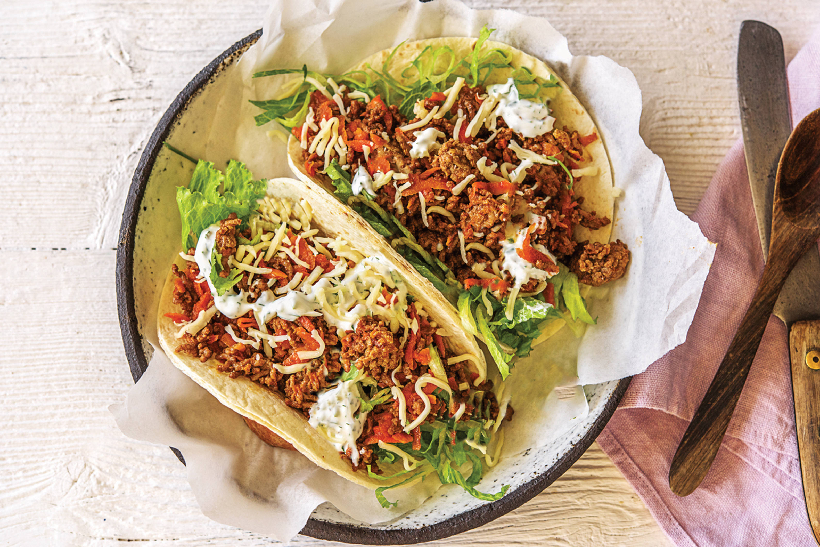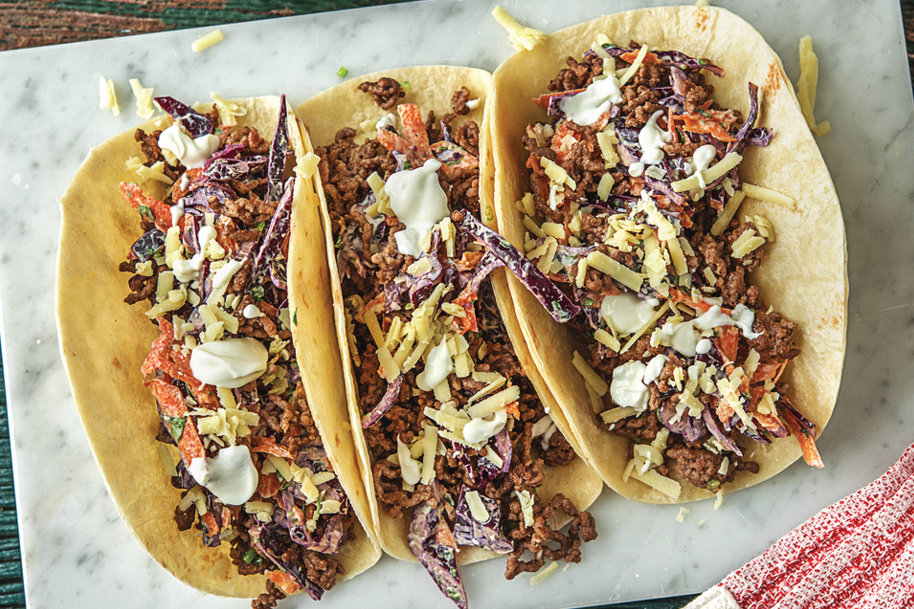 Tacos can be made with any fillings and toppings. Add ground beef, pork, seafood or jackfruit alongside condiments and cheeses.