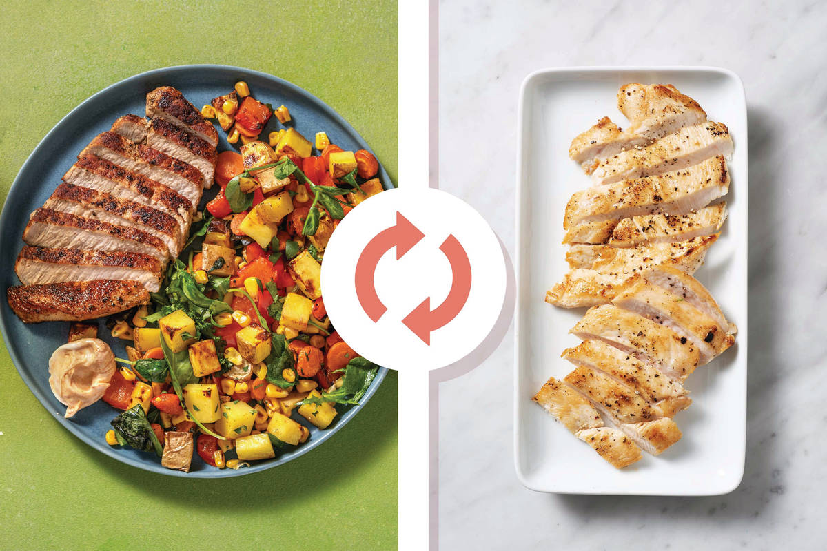 Slice the spiced chicken steaks and divide between plates. Sprinkle the roast veggie toss with the remaining coriander. Serve the pork and roast veggie toss with the smokey aioli.
