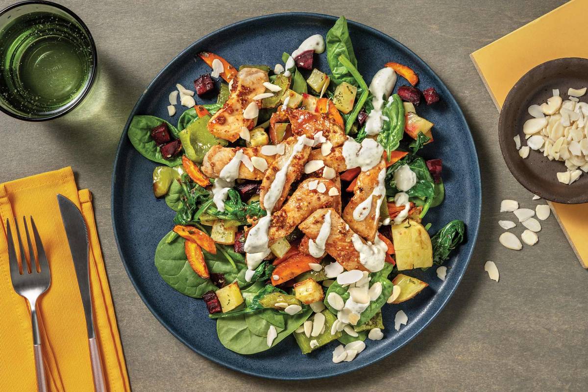 • Divide roast veggie salad between plates. Top with mustard pork. • Drizzle with creamy pesto dressing and sprinkle with flaked almonds to serve. Enjoy!