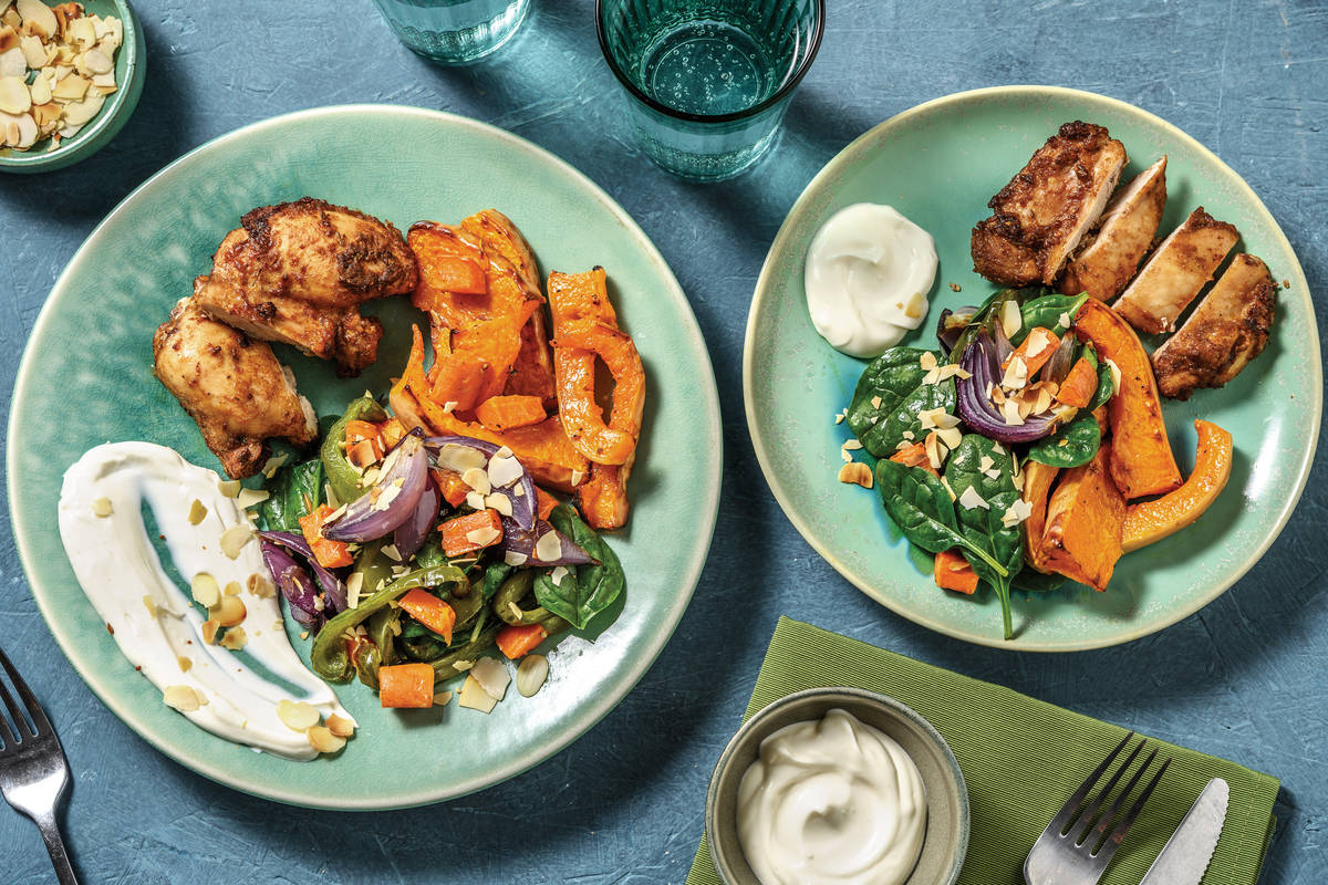 While the veggies are roasting, combine the Nan’s special seasoning and plain flour in a bowl. Add a drizzle of olive oil and season with salt and pepper. Add the chicken thigh and toss to coat. Move the veggies to one side of an oven tray and add the chicken. Roast until cooked through, 20 minutes.