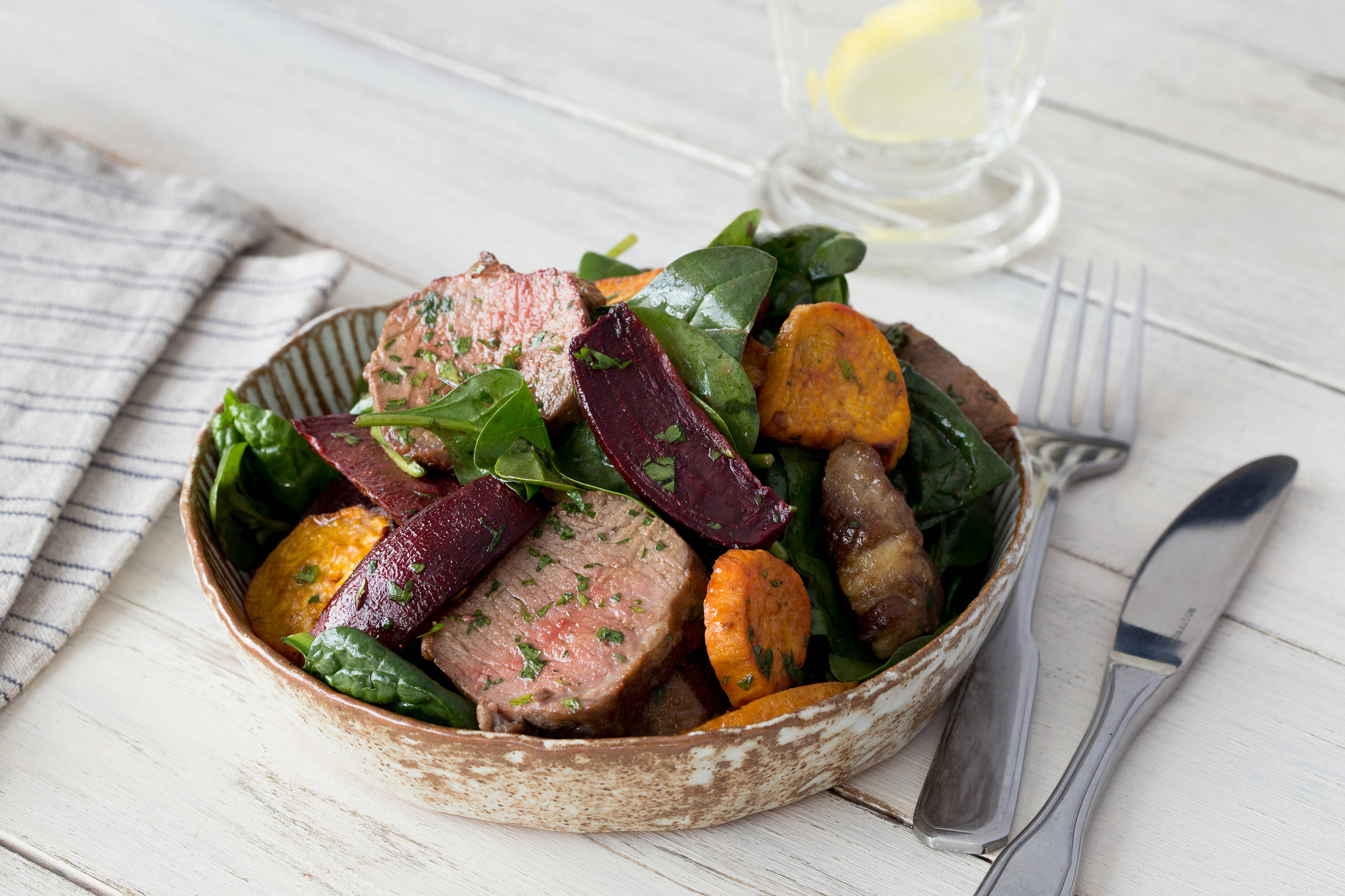 • Preheat oven to 240°C/220°C fan-forced. Cut beetroot into 1cm chunks. • Divide roast veggie mix and beetroot between two lined oven trays. Drizzle with olive oil, season with salt and toss to coat. • Roast until tender, 25-30 minutes.