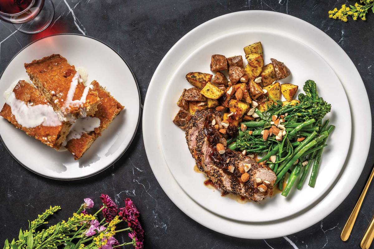 • Roughly chop roasted almonds. • Slice pepper-crusted pork fillet. • Divide pork fillet, roast potato and greens between plates. • Spoon onion sauce over pork fillet. • Sprinkle with chopped almonds to serve. Enjoy!