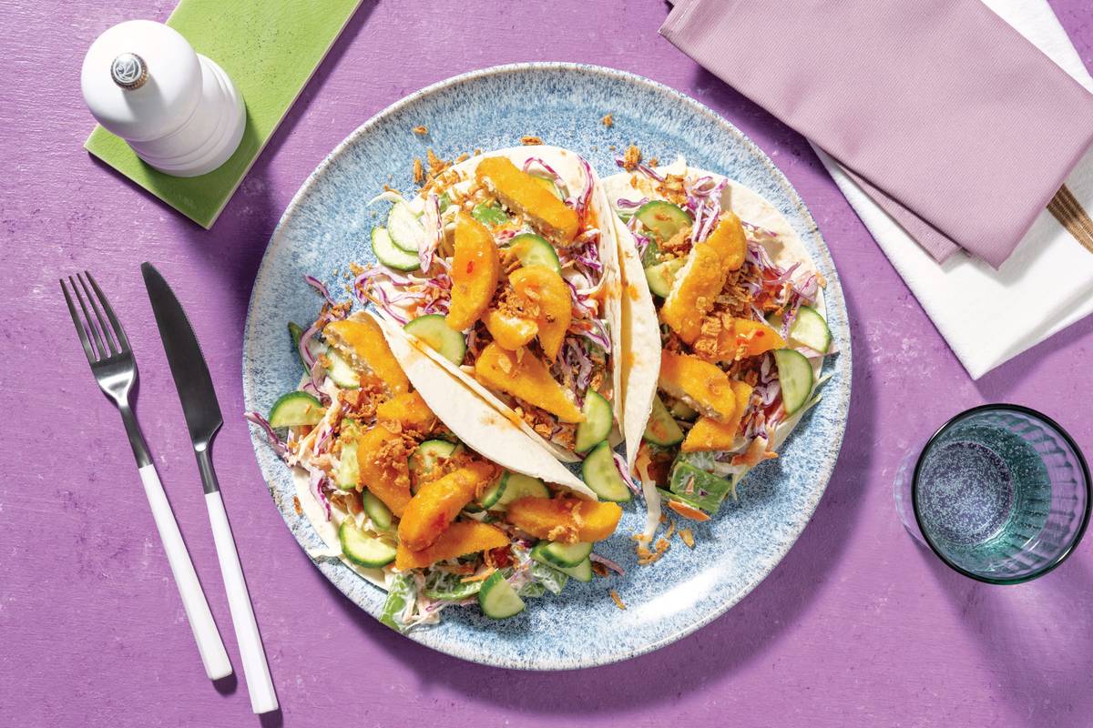 • Build your tacos by filling each tortilla with a helping of creamy slaw, pickled cucumber and plant-based chicken.