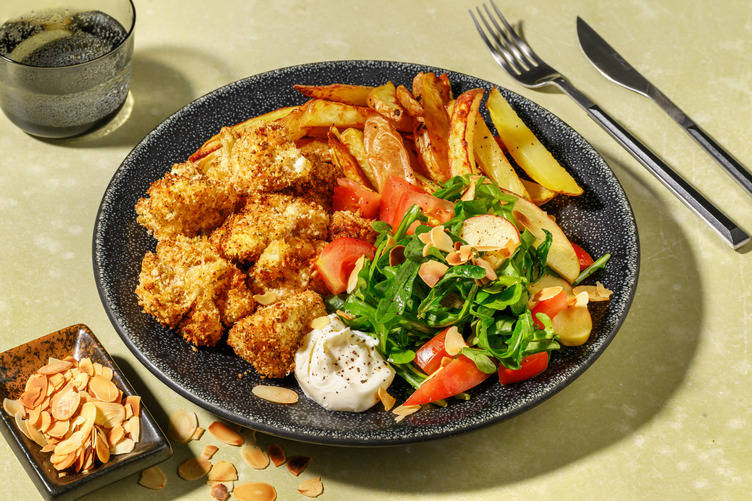 Preheat the oven to 200°C/180°C fan-forced. Bring a kettle of water to the boil. To prepare the ingredients, peel the potatoes and cut them into 2 cm pieces. Cut the cauliflower into small florets and trim the sugar snap peas. Peel, core and thinly slice the apple.
