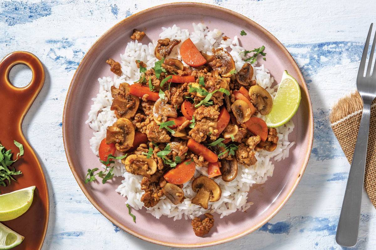Roughly chop the coriander. Divide the garlic rice between bowls. Top with the pork & mushroom stir-fry. Garnish with the coriander and serve with any remaining lime wedges.