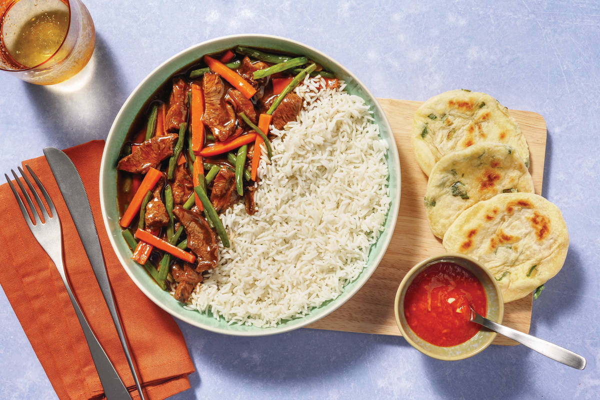 • Divide garlic rice and Chinese spiced prawns between bowls. • Serve with spring onion pancakes and homemade chilli sauce. Enjoy!
