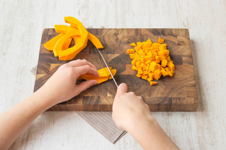 Place the rice into a sieve and rinse it with cold tap water. The water will initially become cloudy, continue to rinse until the water becomes clear enough (it doesn’t need to be crystal). Bring a large pot of salted water to the boil. Add the rice and cook it for 10-12 minutes or until soft. Drain. Meanwhile peel and cut the pumpkin into 2cm cubes.