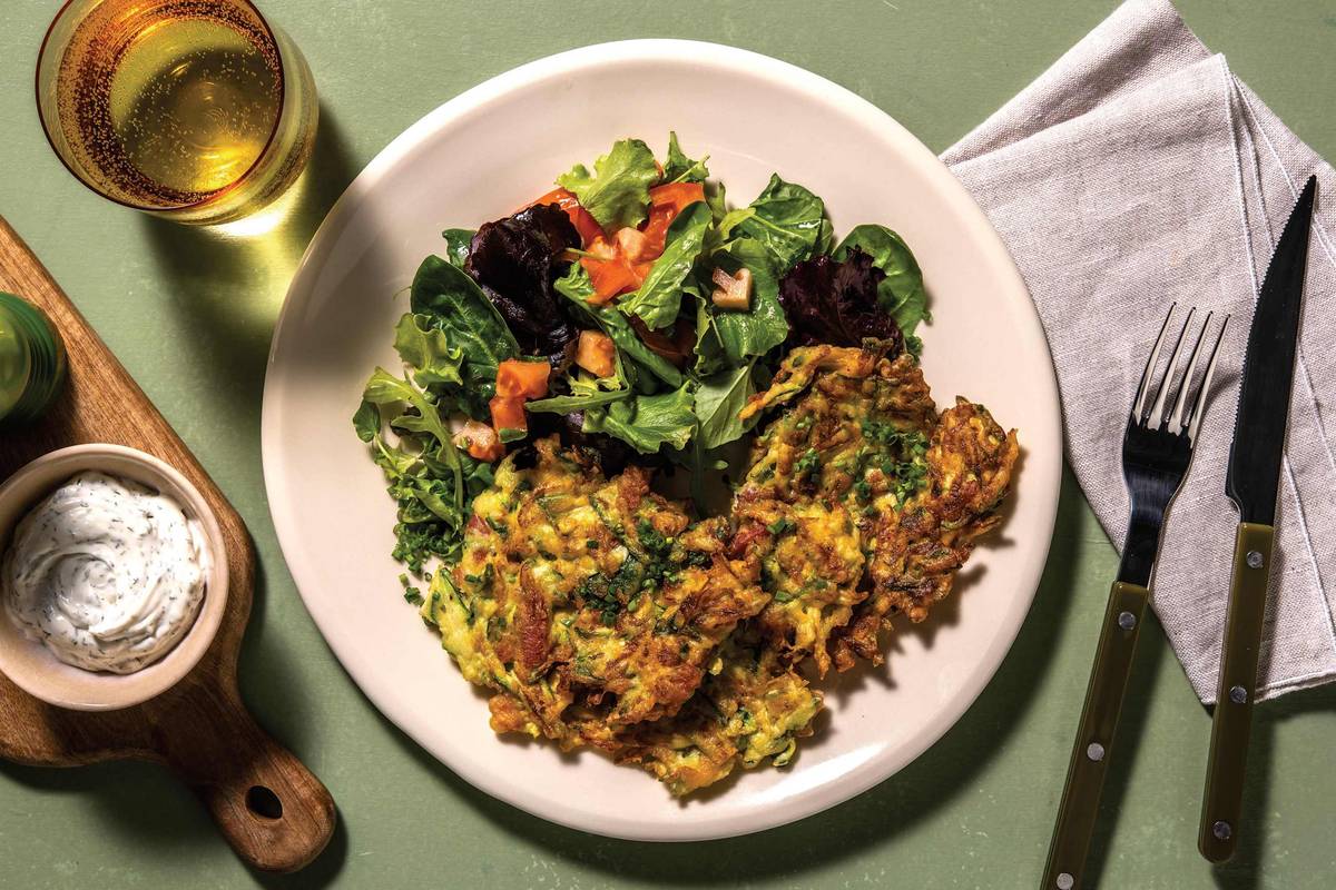 • Return pan to medium-high heat with enough olive oil to coat the base. • When the oil is hot, add heaped tablespoons of fritter mixture, in batches, flattening with a spatula. Cook until golden, 3-4 minutes each side (don't flip too early!). • Transfer to a paper towel-lined plate. You should get 3-4 fritters per person.